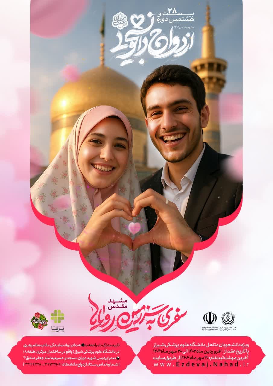 به گزارش روابط عمومی دفترنهاد رهبری دردانشگاه علوم پزشکی شیراز؛ عباس سلطانی با بیان اینکه بر اساس آمارهای کشوری امروزه ازدواج های دانشجویی کمتر از 5 درصد آن به طلاق ختم می شود اظهارداشت:با تلاش دفترنهاد رهبری در دانشگاه های کشور وهمچنین علوم پزشکی شیراز از آغاز ثبت نام تاکنون 80نفر برای این سفر معنوی ثبت نام کرده اند که  تلاش داریم علاوه بر زیارت حرم مطهر امام رضا(ع)، کارگاه‌های آموزشی تخصصی در طول سفر، در زمینه خانواده و مدیریت زندگی مشترک برگزار می‌شود تا دانشجویان بتوانند با آگاهی بیشتر، بنیان خانواده‌ای مستحکم بنا نهند.